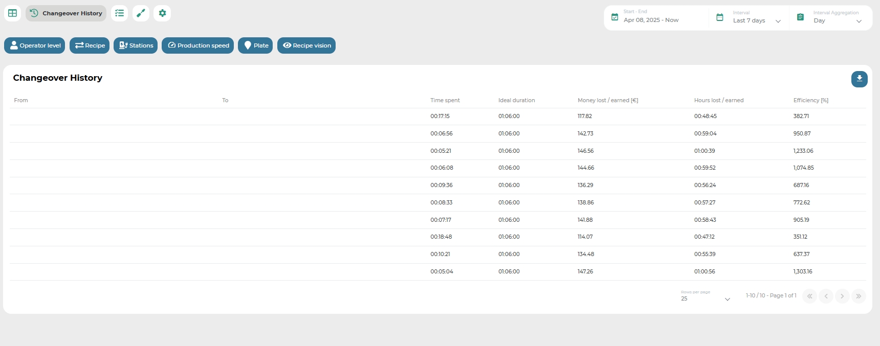 In the central part of the page, a table lists all the format changes that occurred within the selected time range. Additionally, the table includes the values of various KPIs, each calculated specifically for the corresponding format change event.