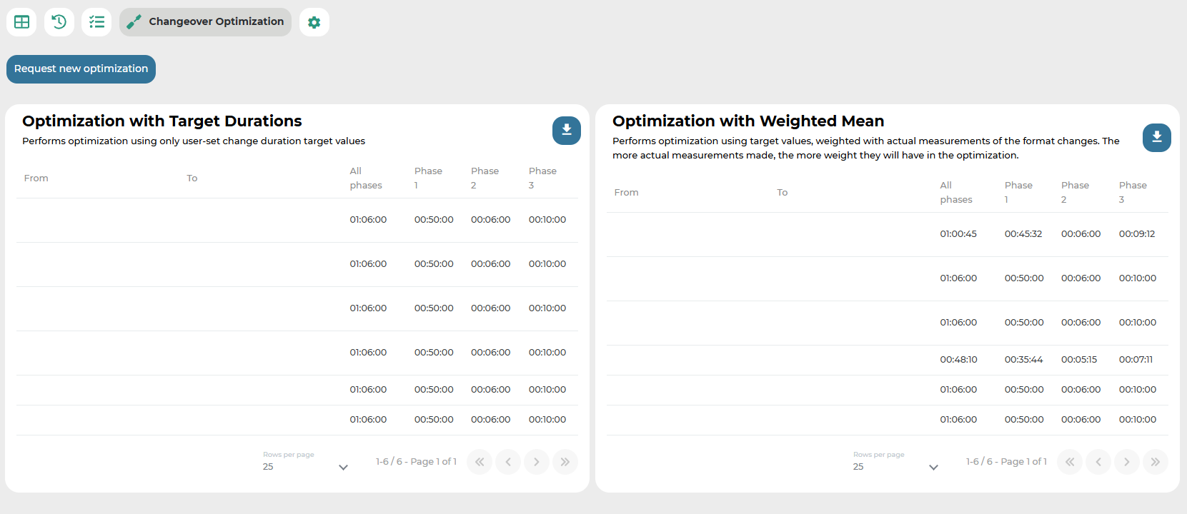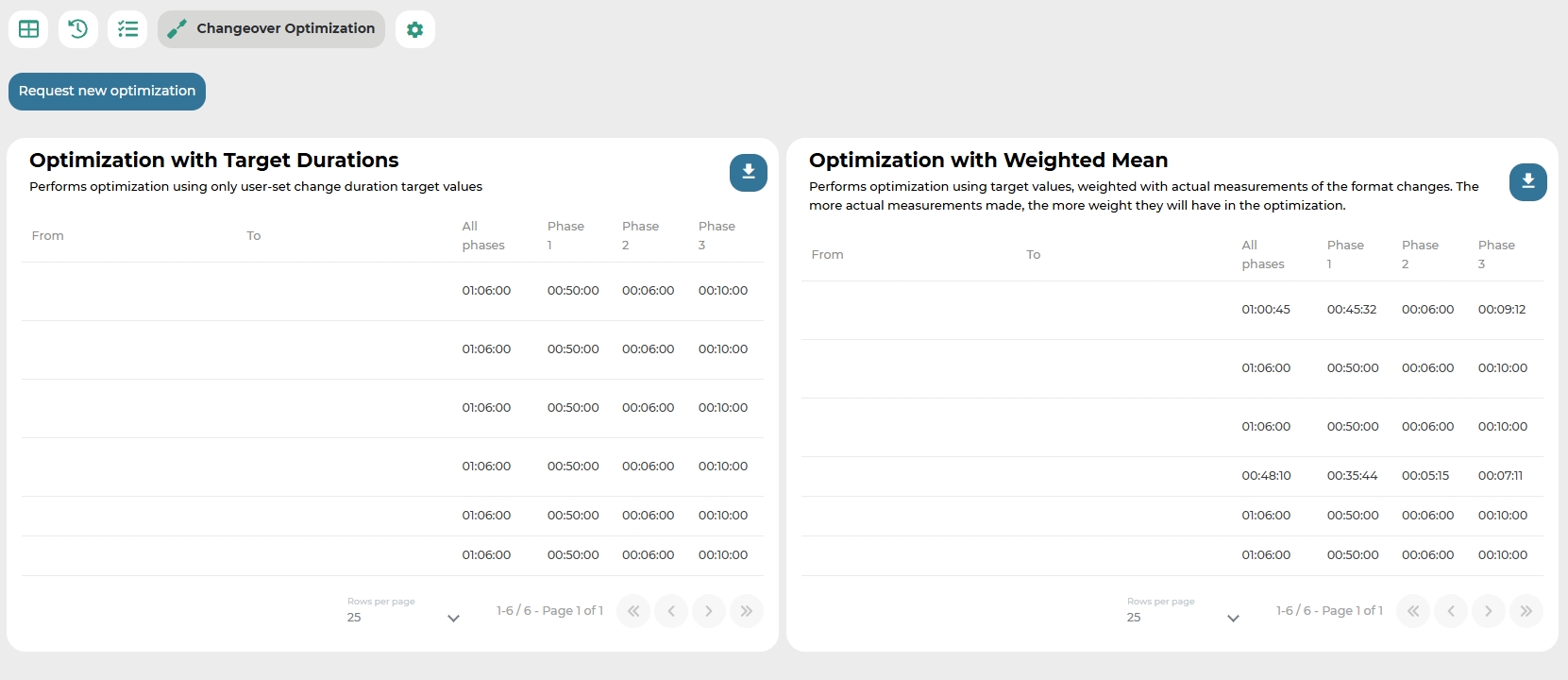 Optimization using Prior Mean: This table shows the optimal sequence of format changes to be performed on the machine to achieve the shortest total changeover time. The calculation is based on ideal times manually entered by the user in the dedicated configuration section.