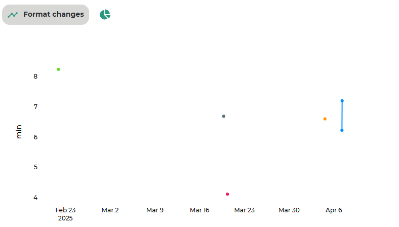 The y-axis represents the value of the selected KPI. Each point represents a specific format change and the corresponding KPI value. By switching the view, a pie chart is displayed instead, showing how the time spent across all selected format changes is distributed among the different phases. Note: if a single phase is selected, the chart will refer exclusively to that phase.