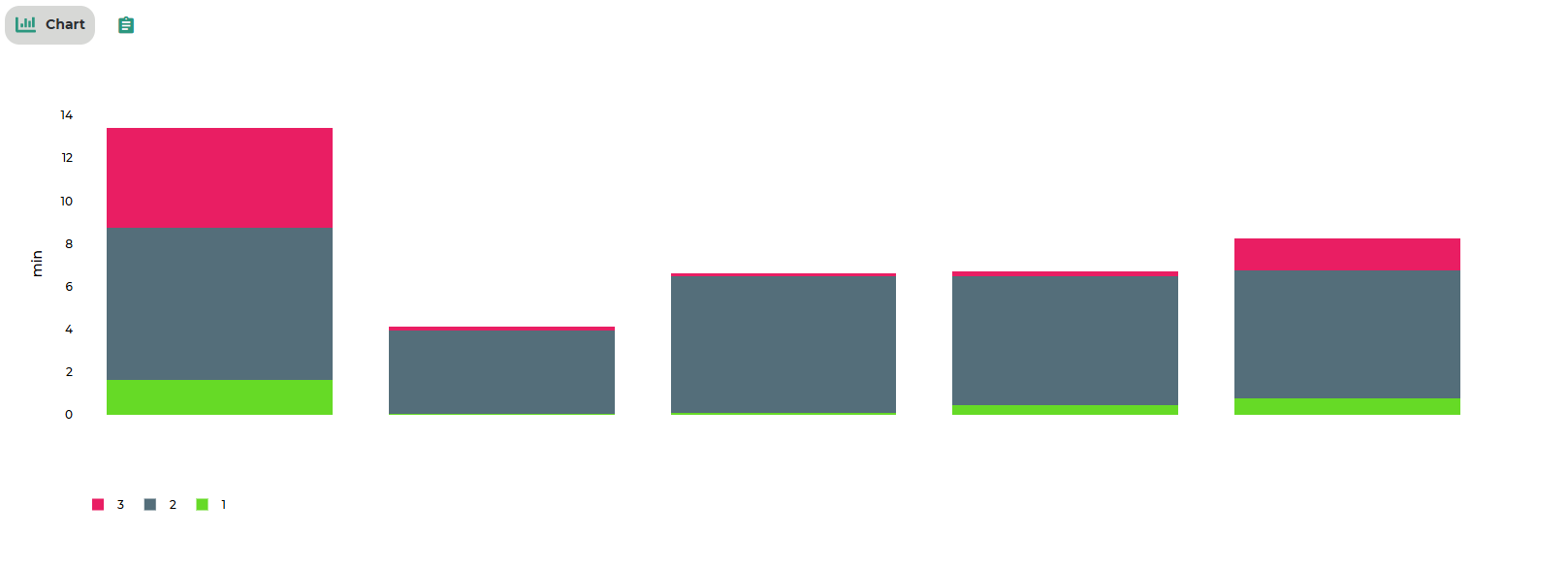 On the y-axis, the corresponding KPI values are displayed. If all phases are selected, the analysis is broken down by phase and all phases are shown in the chart. If a single phase is selected, each format change will only show the bar for that specific phase. Data from this chart can also be displayed in tabular format via a dedicated view switch.