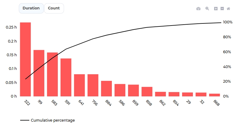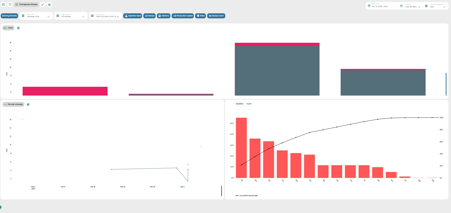 Pareto chart: This chart provides a Pareto analysis of alarms that occurred during the selected format changes.