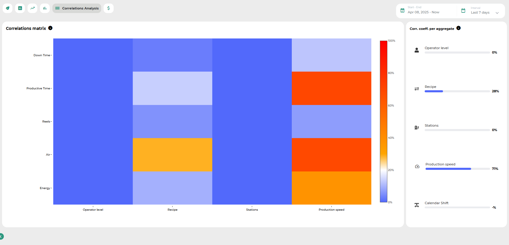 This section presents a statistical analysis of data within the selected time interval. The entire page is dominated by a heatmap, which graphically represents the degree of cost correlation between the various elements included in the analysis.