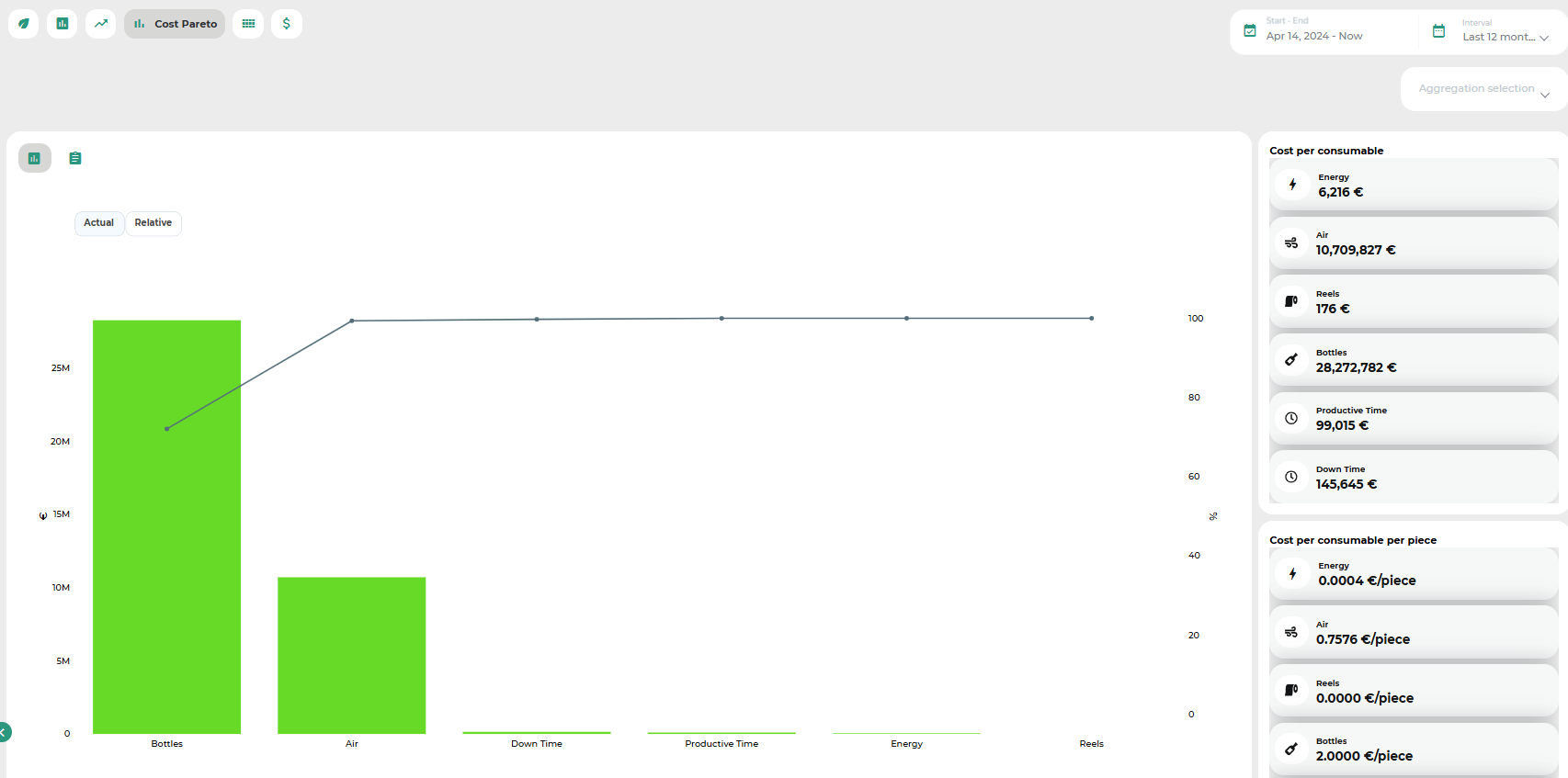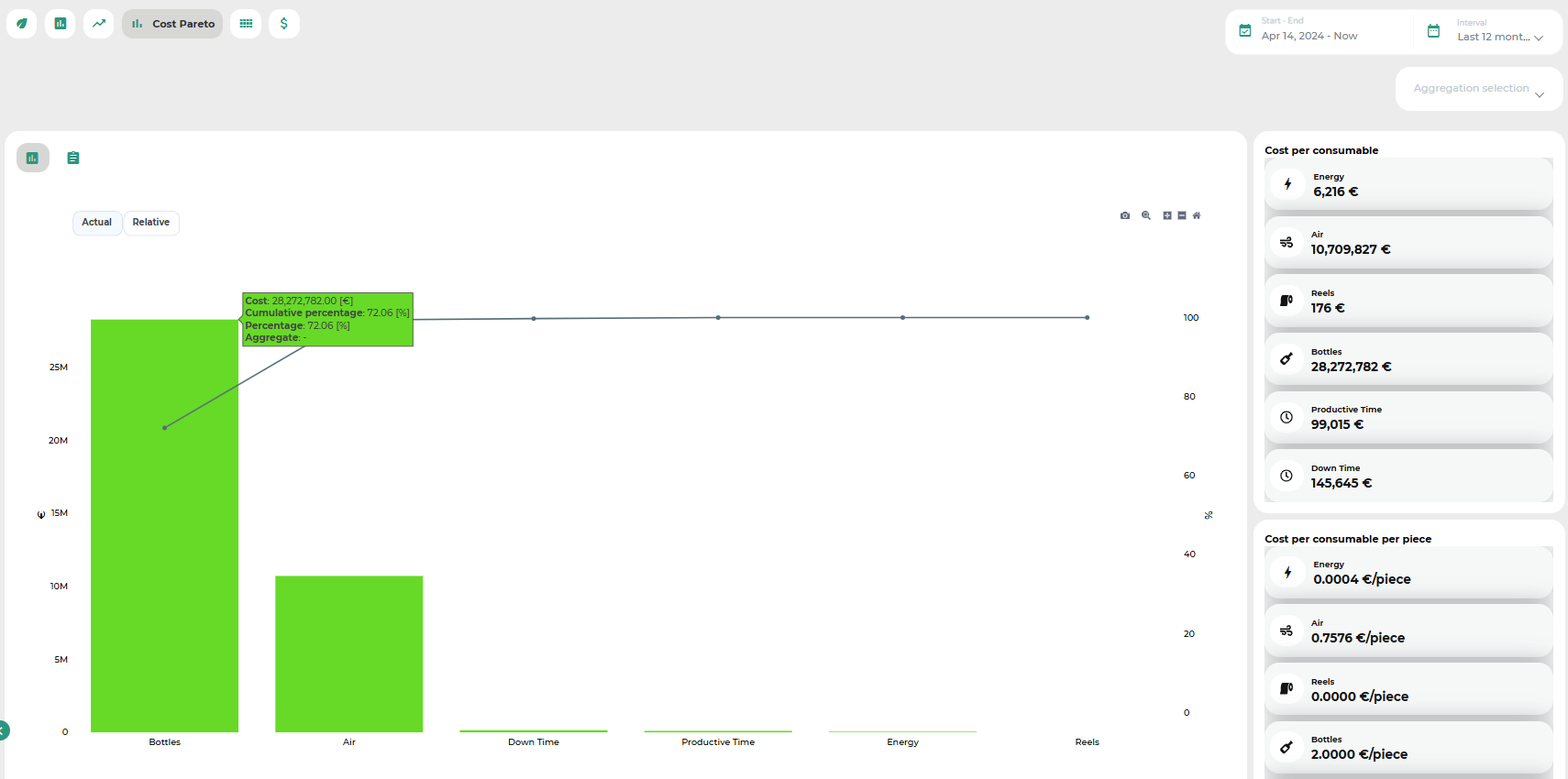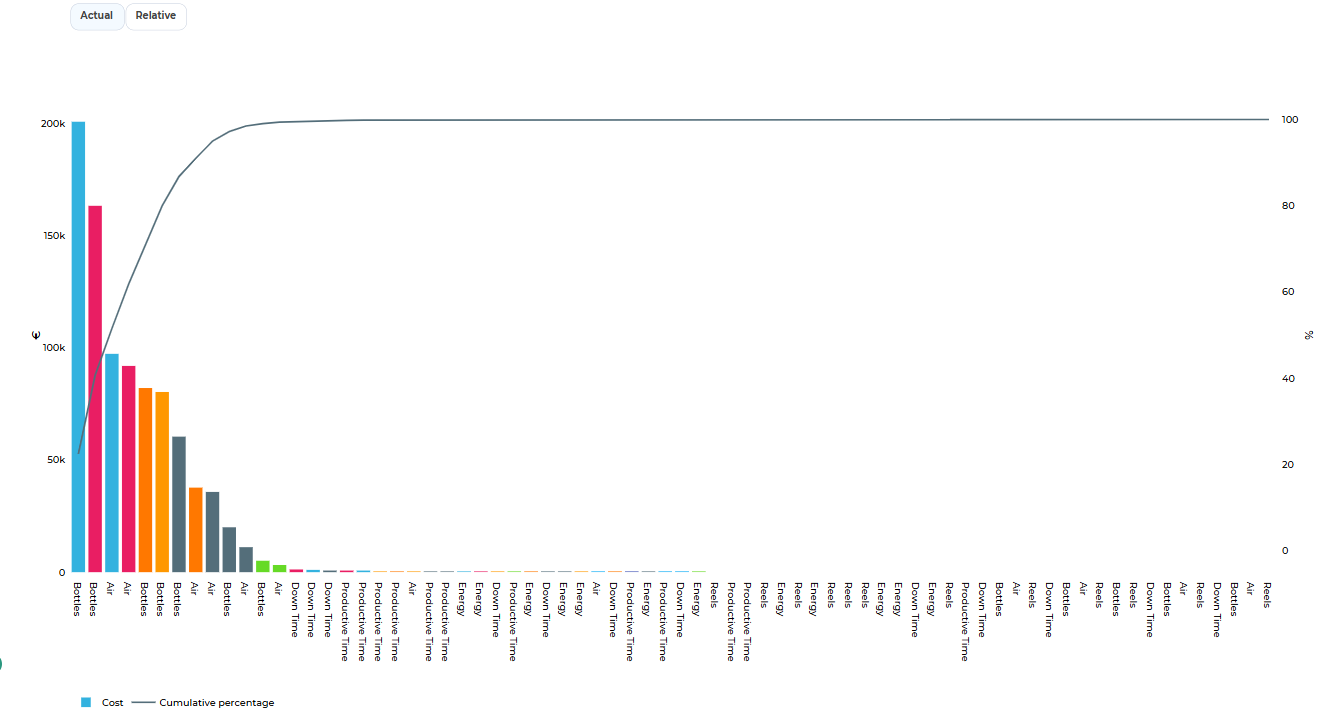 A Pareto chart visually highlights the cost impact associated with the use of each consumable. By hovering over the bars, detailed tooltips provide additional information for each item.