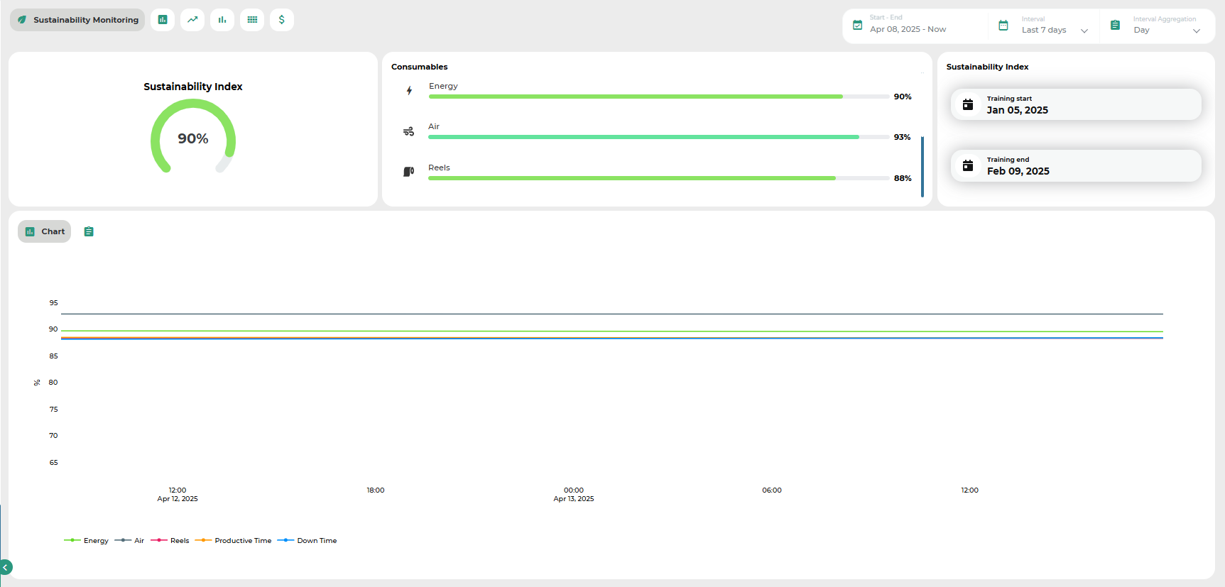 This page displays data related to the Sustainability Index (SI). Both the time range for the analysis and the data granularity can be configured by the user.
