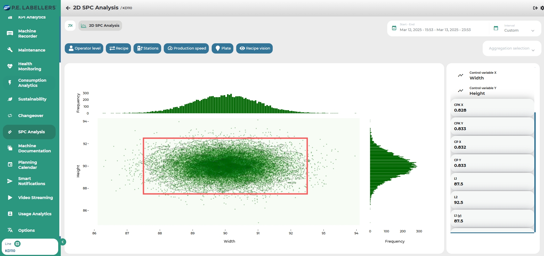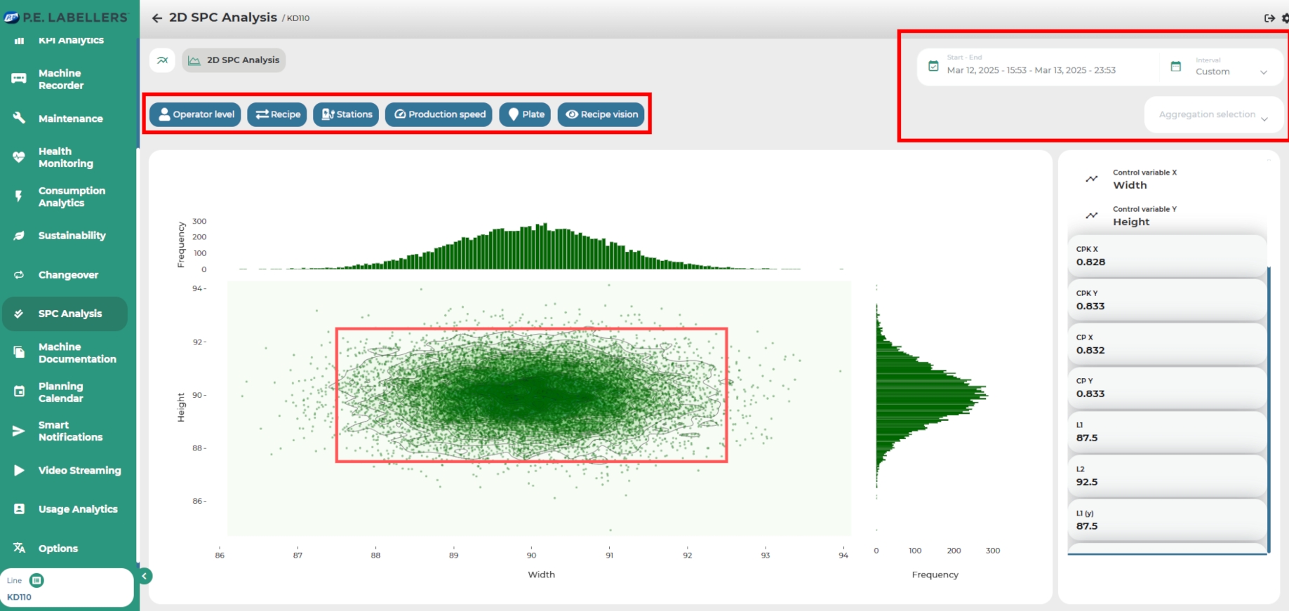 On the lateral side, general information about the analysis is provided, such as the number of produced units, the number of units considered as scrap, the type of applied constraint, the limit values for that constraint, the mean value, and the standard deviation of the data, etc. Each of these pieces of information is calculated using both the data from the constraint on the X-axis and the data from the constraint on the Y-axis.